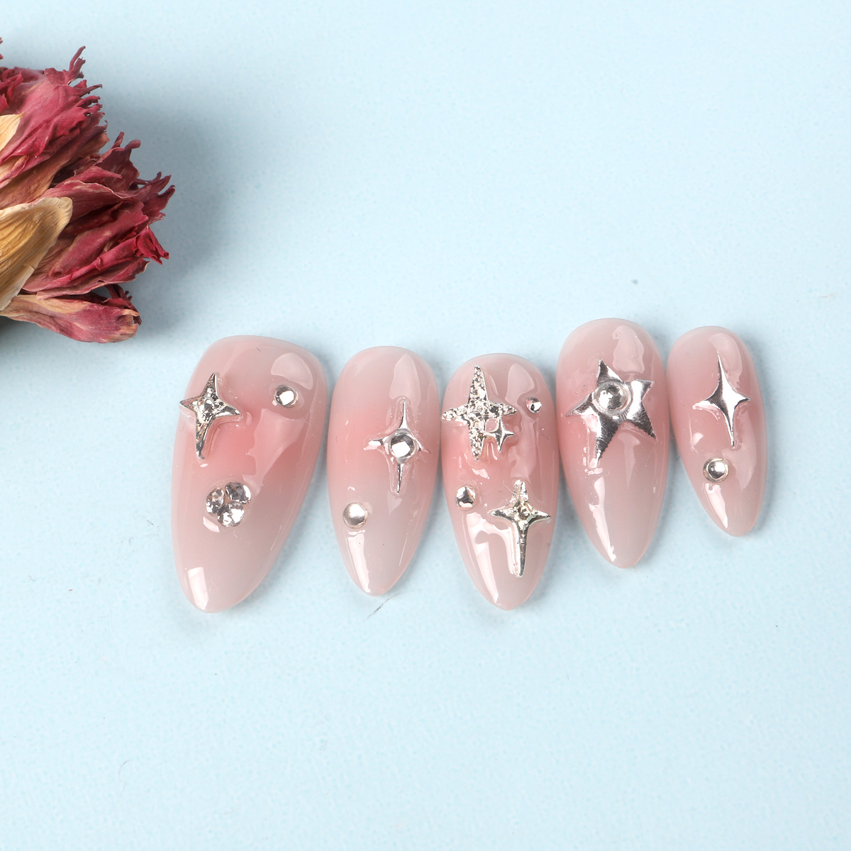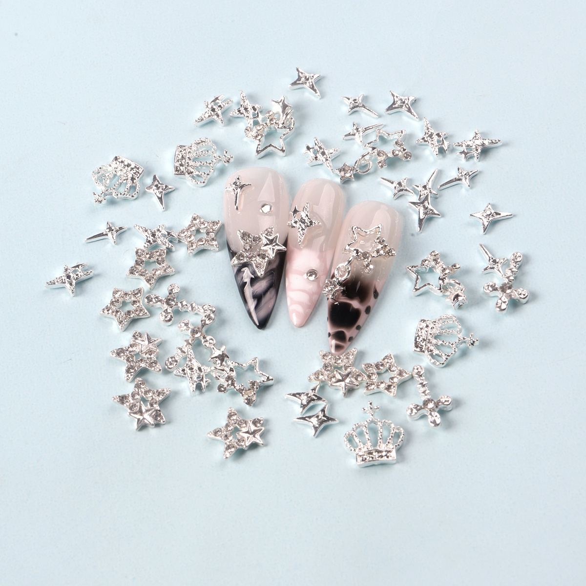 Denna högkvalitativa mix innehåller 50 eleganta metallberlocker i olika former, perfekt för iögonfallande, glamorösa och kreativa mönster. Oavsett om det är stjärnor, kronor, kors eller gnistrande miniprydnader - varje enskilt overlay är lätt att placera på nageln och ger en lyxig finish.